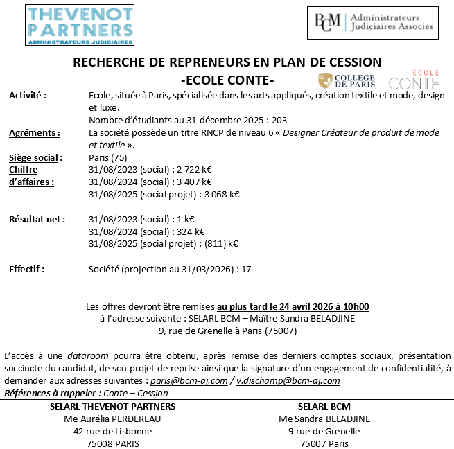 RECHERCHE DE REPRENEURS EN PLAN DE CESSION : ÉCOLE CONTE/ École, située à Paris, spécialisée dans les arts appliqués, création textile et mode, design et luxe – DLDO le 24/04/2026 à 10h00
